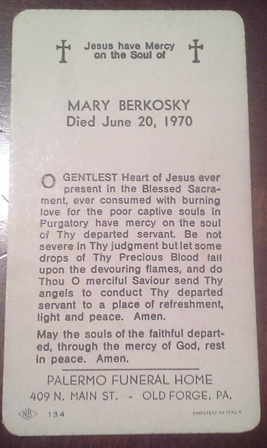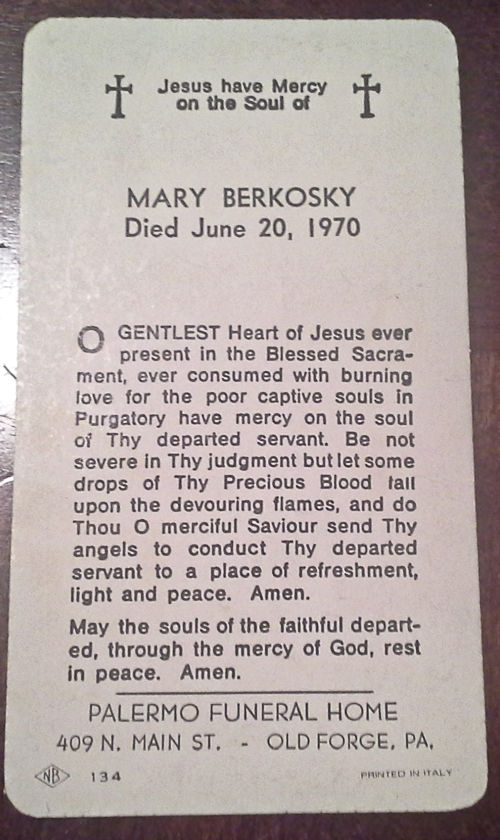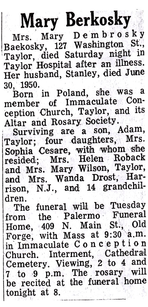 Above: Obituary for Mary Berkosky. She died June 20, 1970.