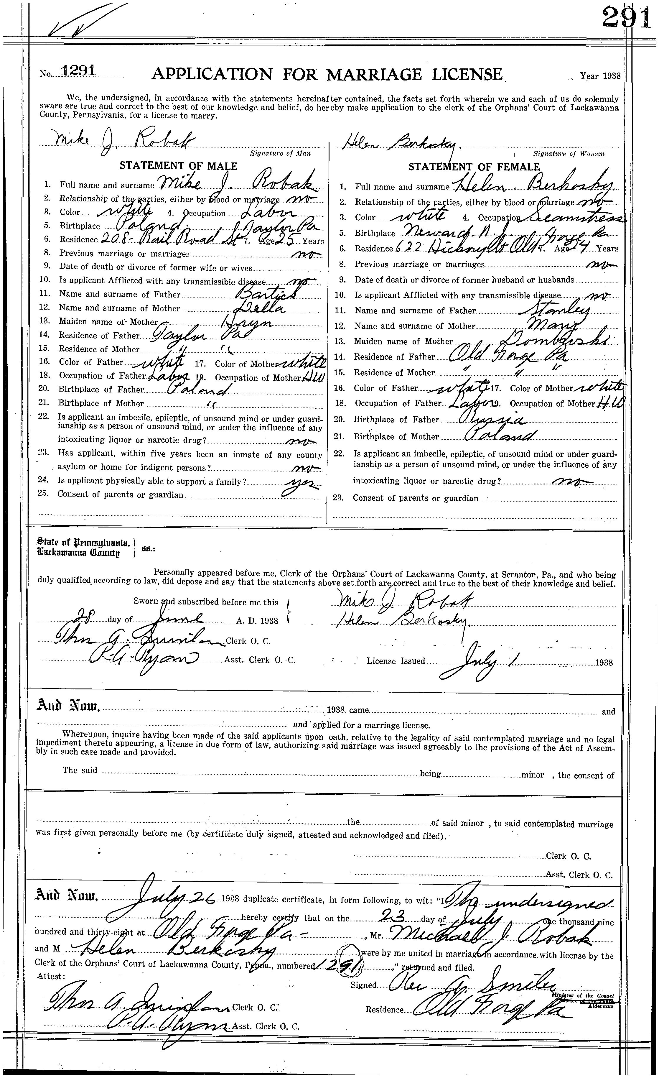 1938 Marriage License Application for Michael J. Robak and Helen Berkosky (daughter of Mary and Stanley).