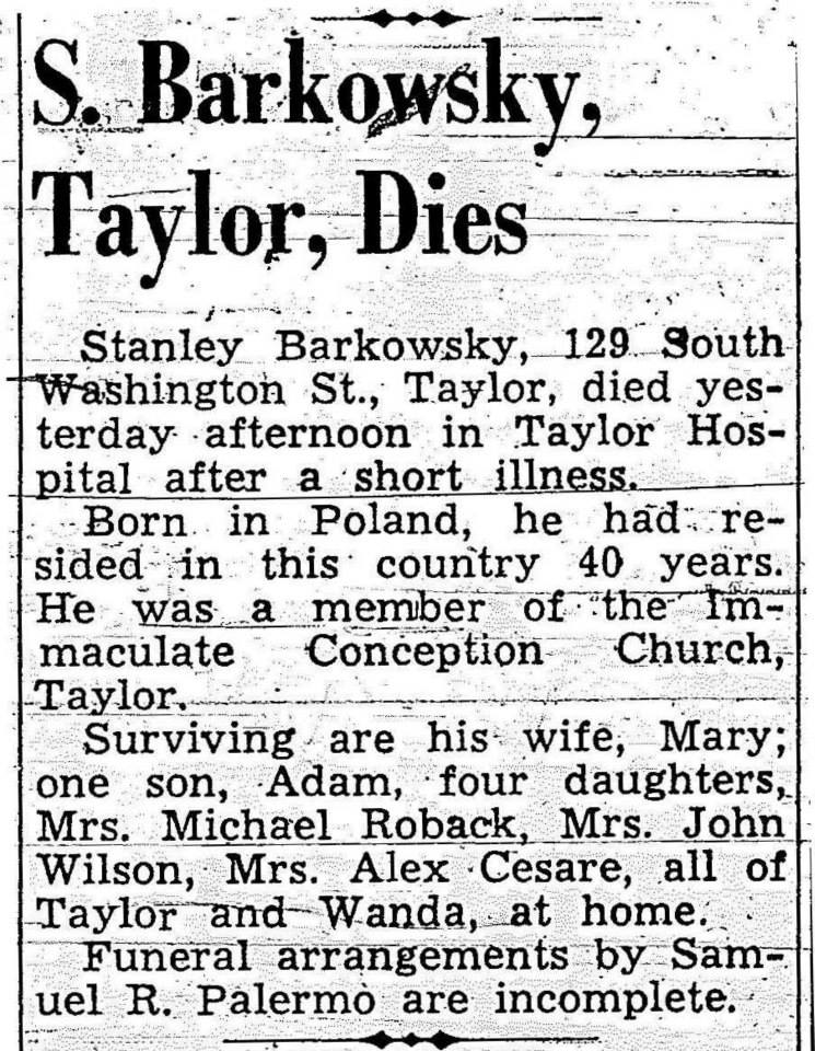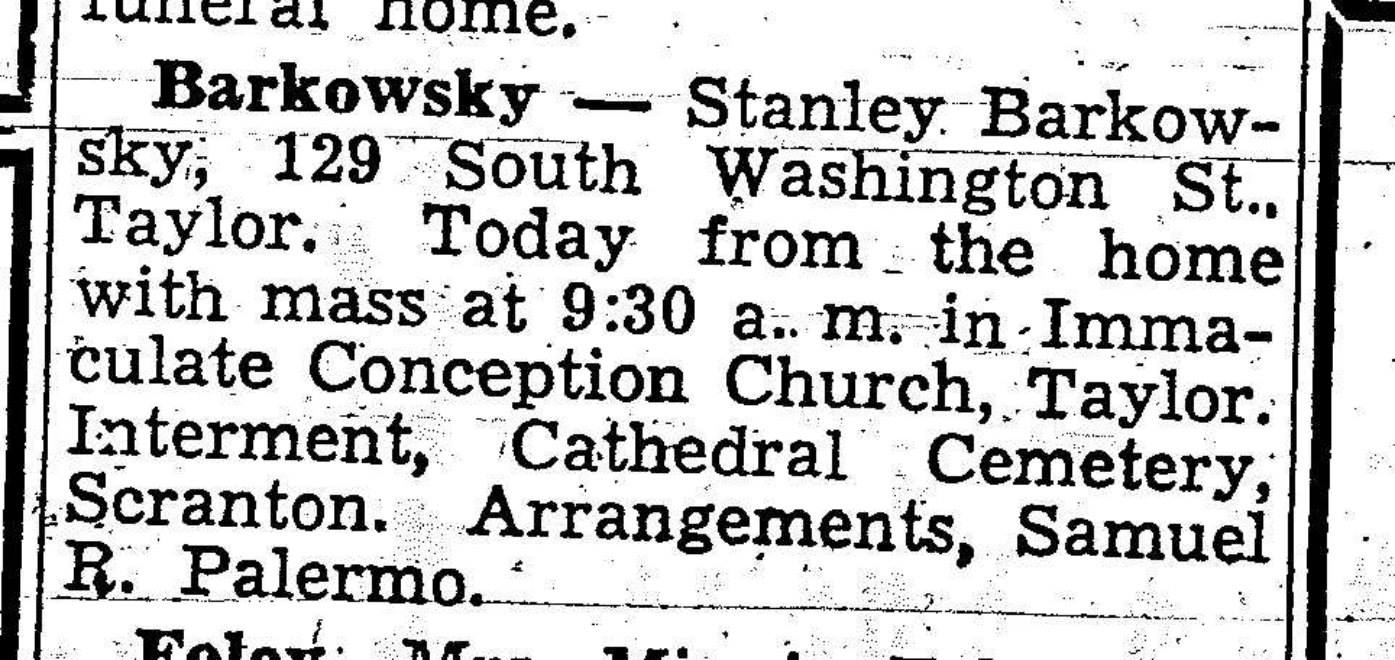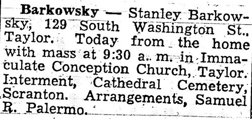 Stanley Barkowsky obit 1950 died June 30, 1950