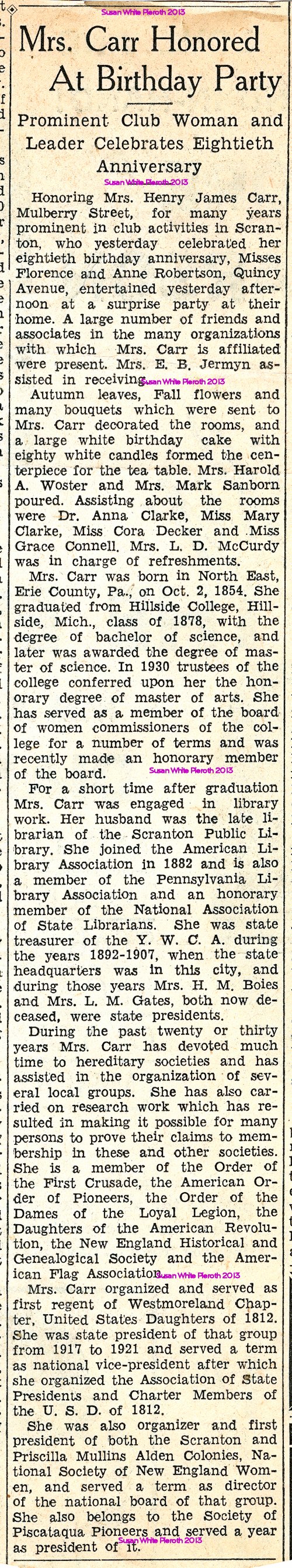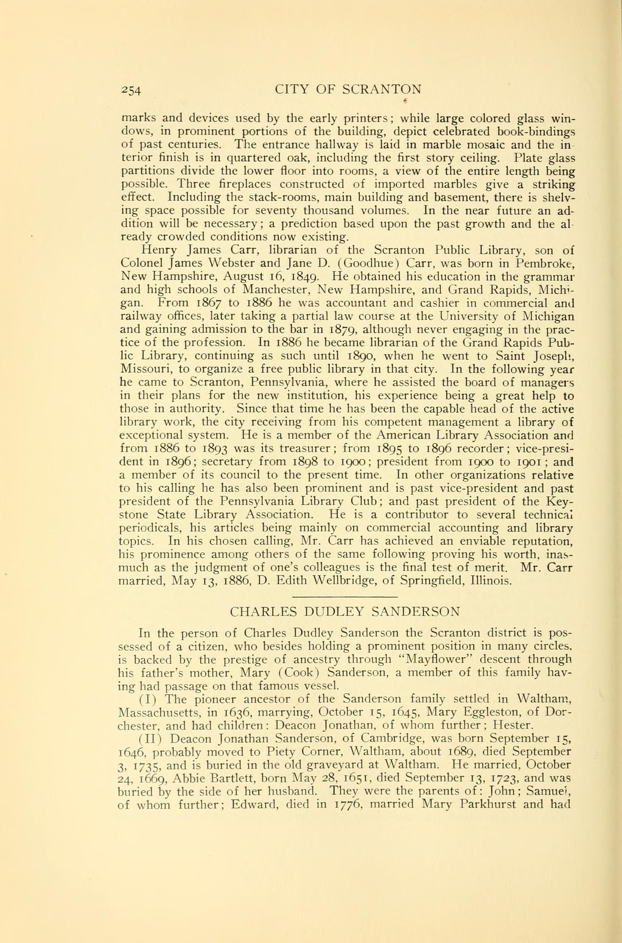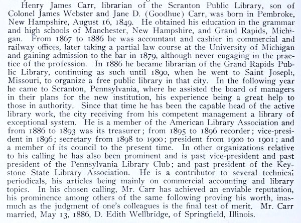 - free. Henry James Carr was the son of Jane D. Goodhue and Colonel James Webster Carr. He was born August 16, 1849 in Pembroke, New Hampshire. He was the first librarian of the Albright Memorial Library, in Scranton. Note: His wife's maiden name is misspelled. |