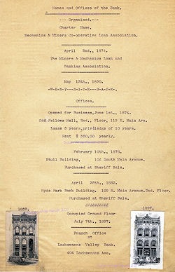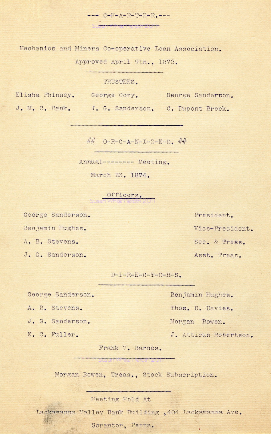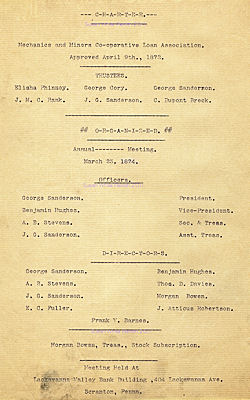 | Mechanics and Miners C-operative Loan Association Approved April 9th, 1873 Elisha Phinney George Cory George Sanderson J. M. C. Bank J. G. Sanderson Benjamin Hughes A. B. Stevens E. C. Fuller Morgan Bowen |