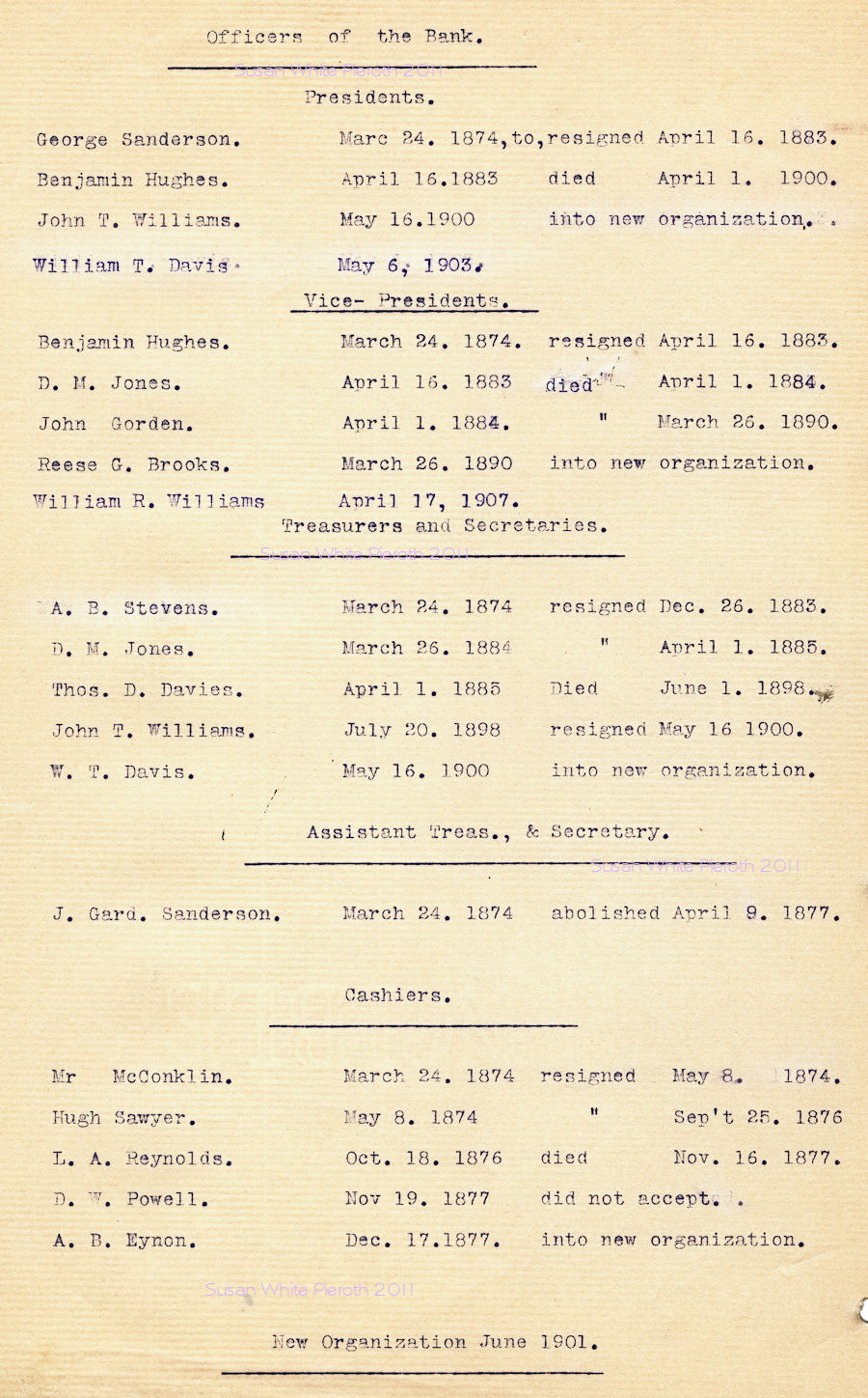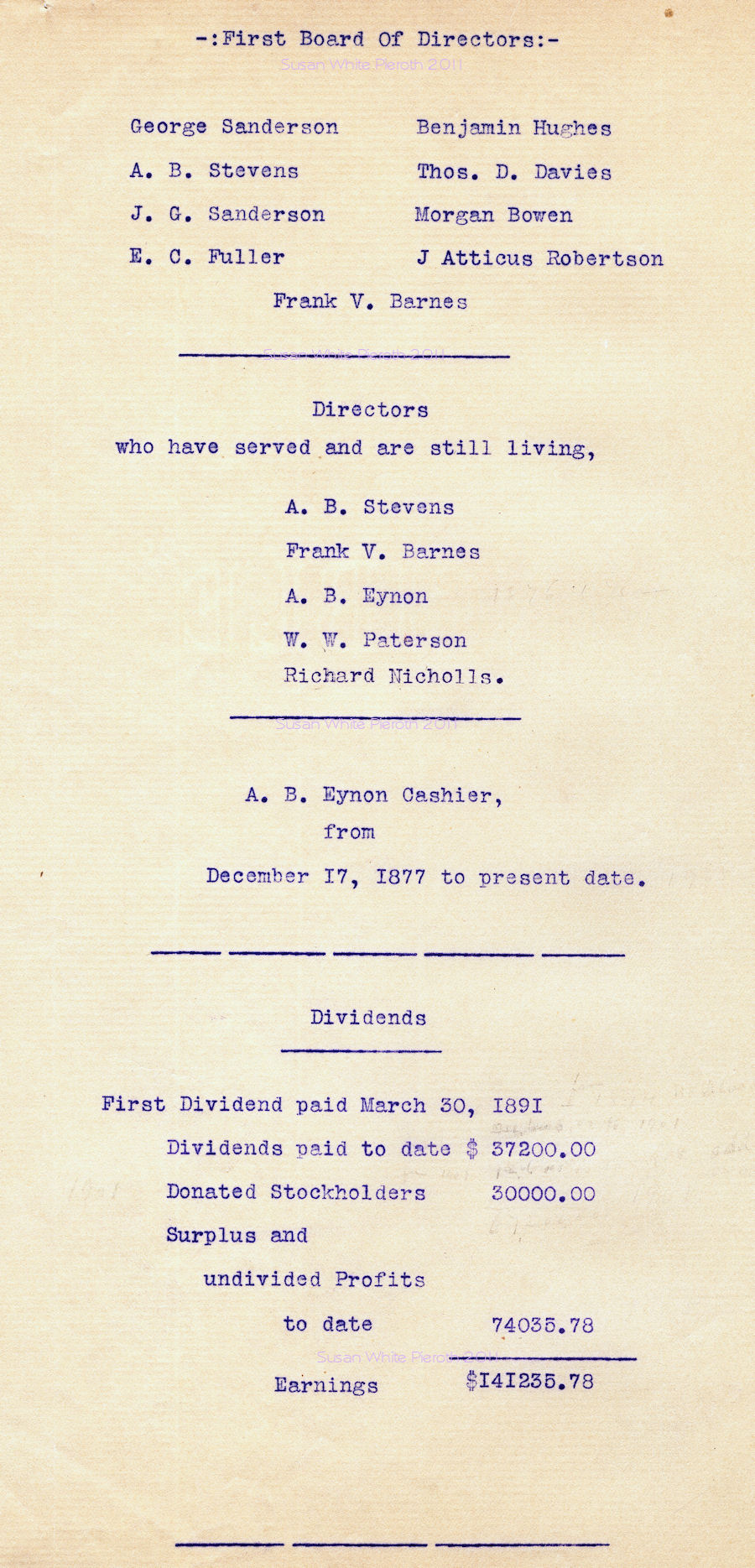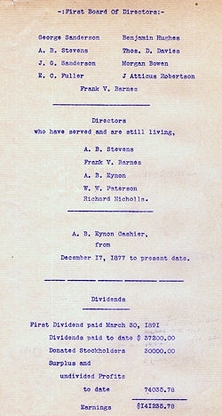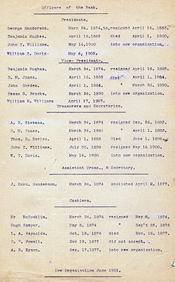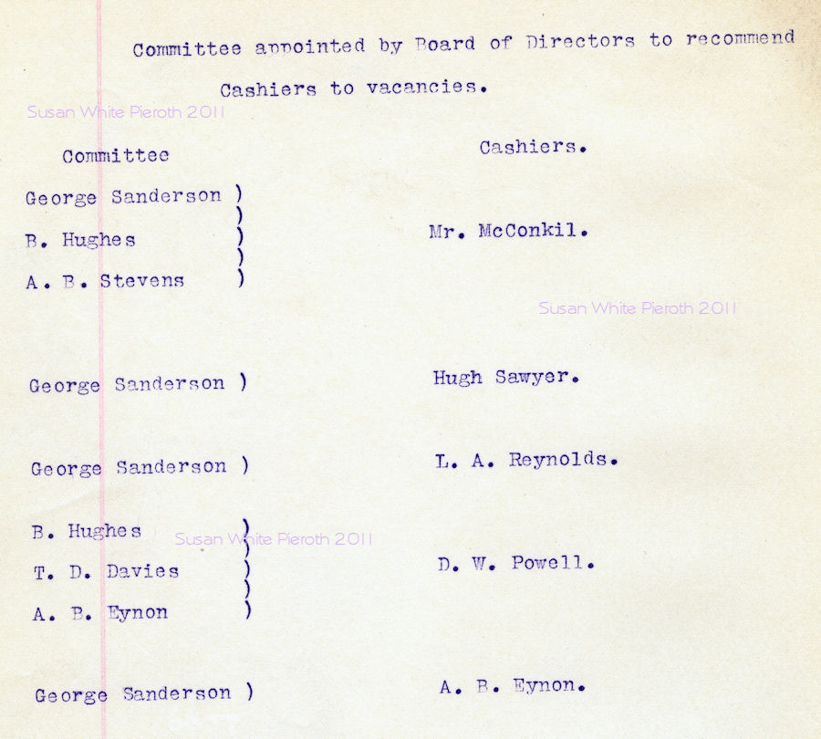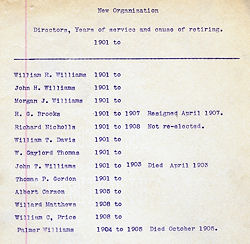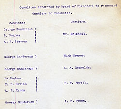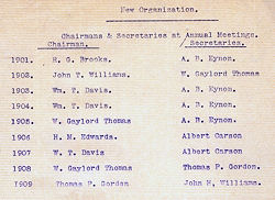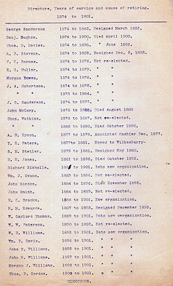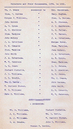 | George Sanderson Benjamin Hughes A. B. Stevns Thos. D. Davies J. G. Sanderson Morgan Bowen E. C. Fuller J. Atticus Robertson Frank V. Barnes A. B. Eynon W. W. Paterson Richard Nicholls A. B. Eynon |