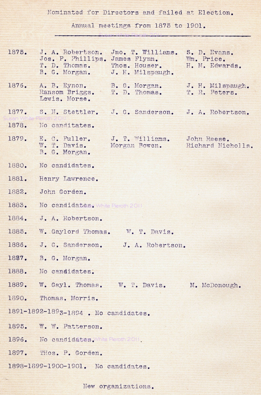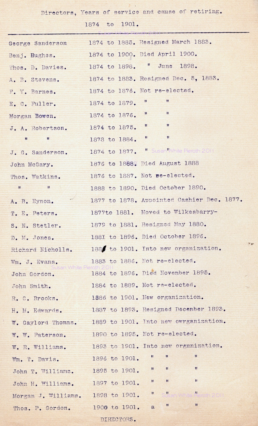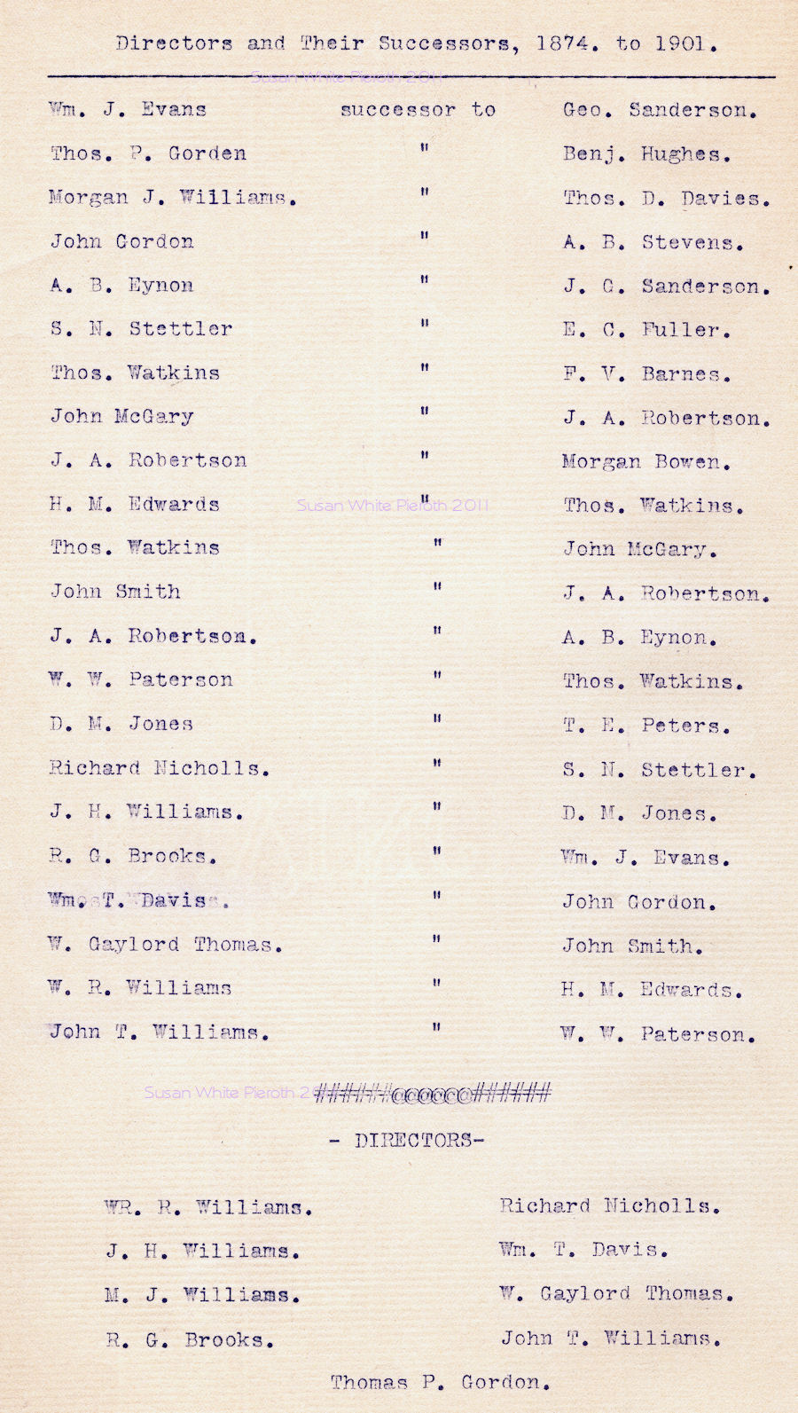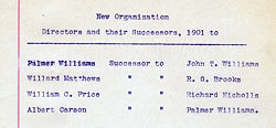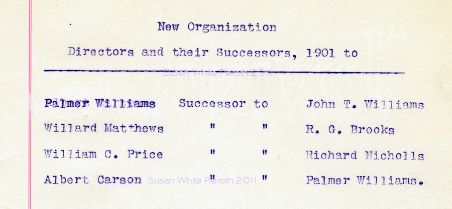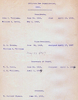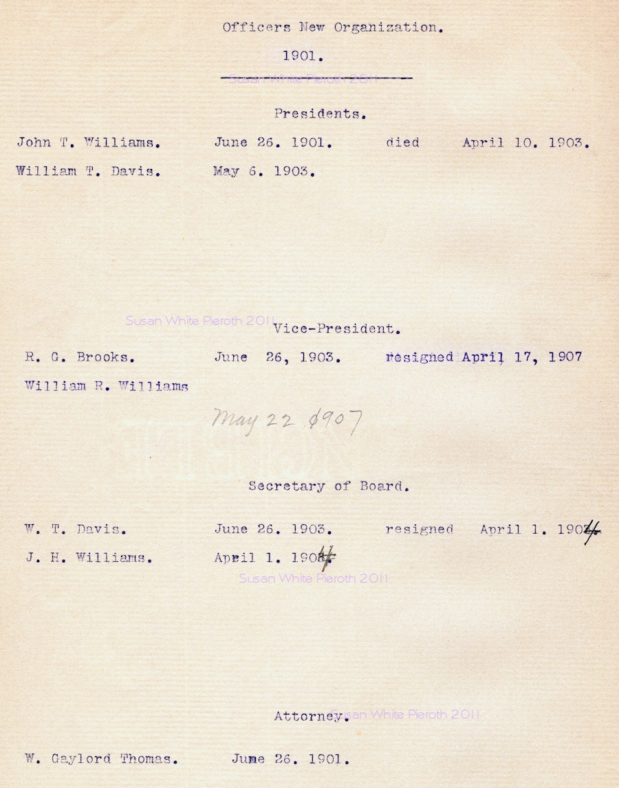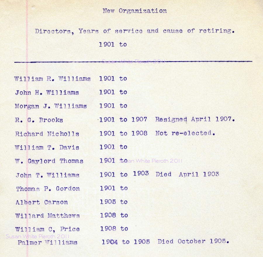 | William R. Williams John H. Williams Morgan J. Williams R. G. Brooks Richard Nicholls William t. Davis W. Gaylord Thomas John T. Williams Thomas P. Gordon Albert Carson Willard Matthews William C. Price Palmer Williams |