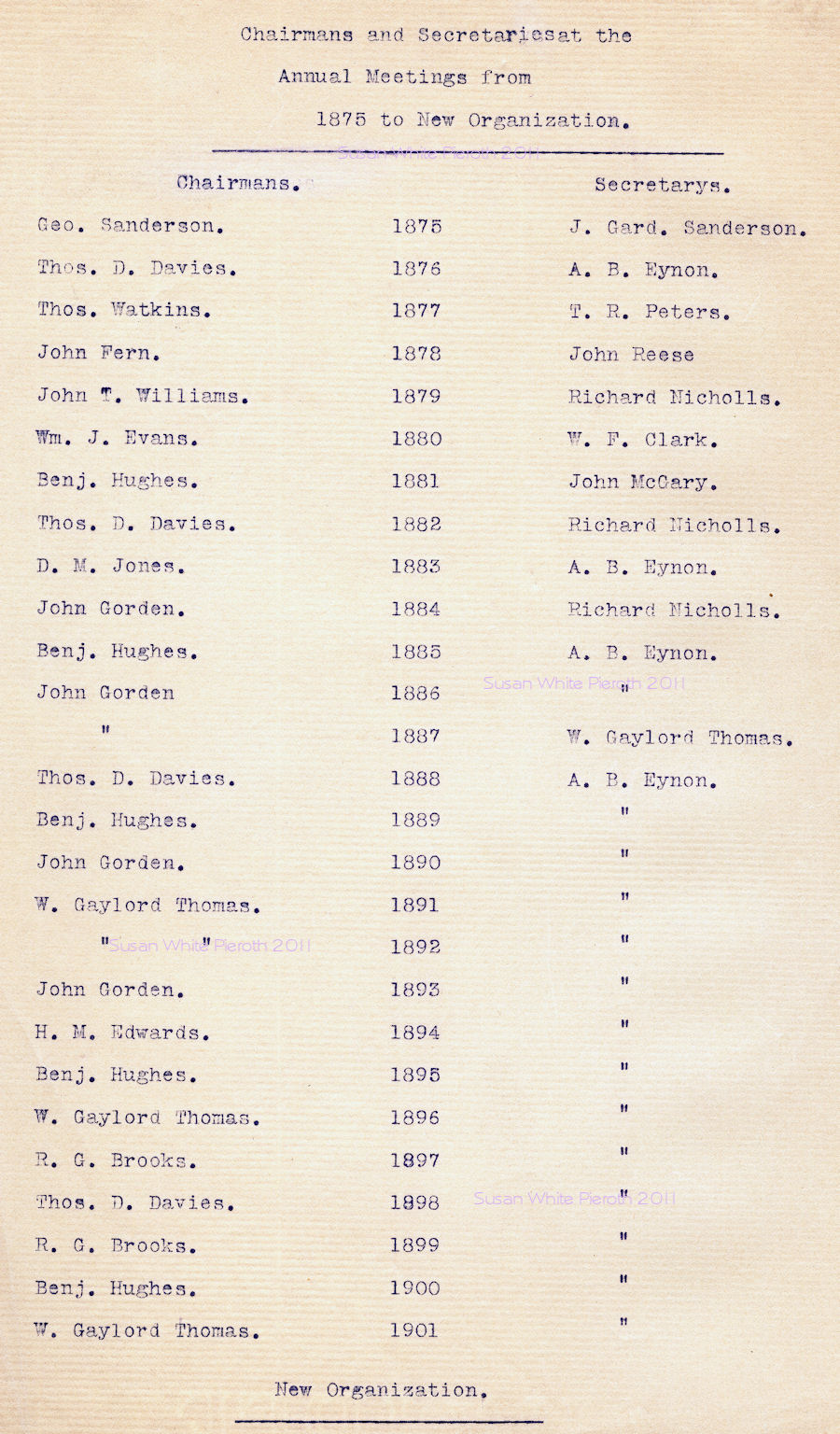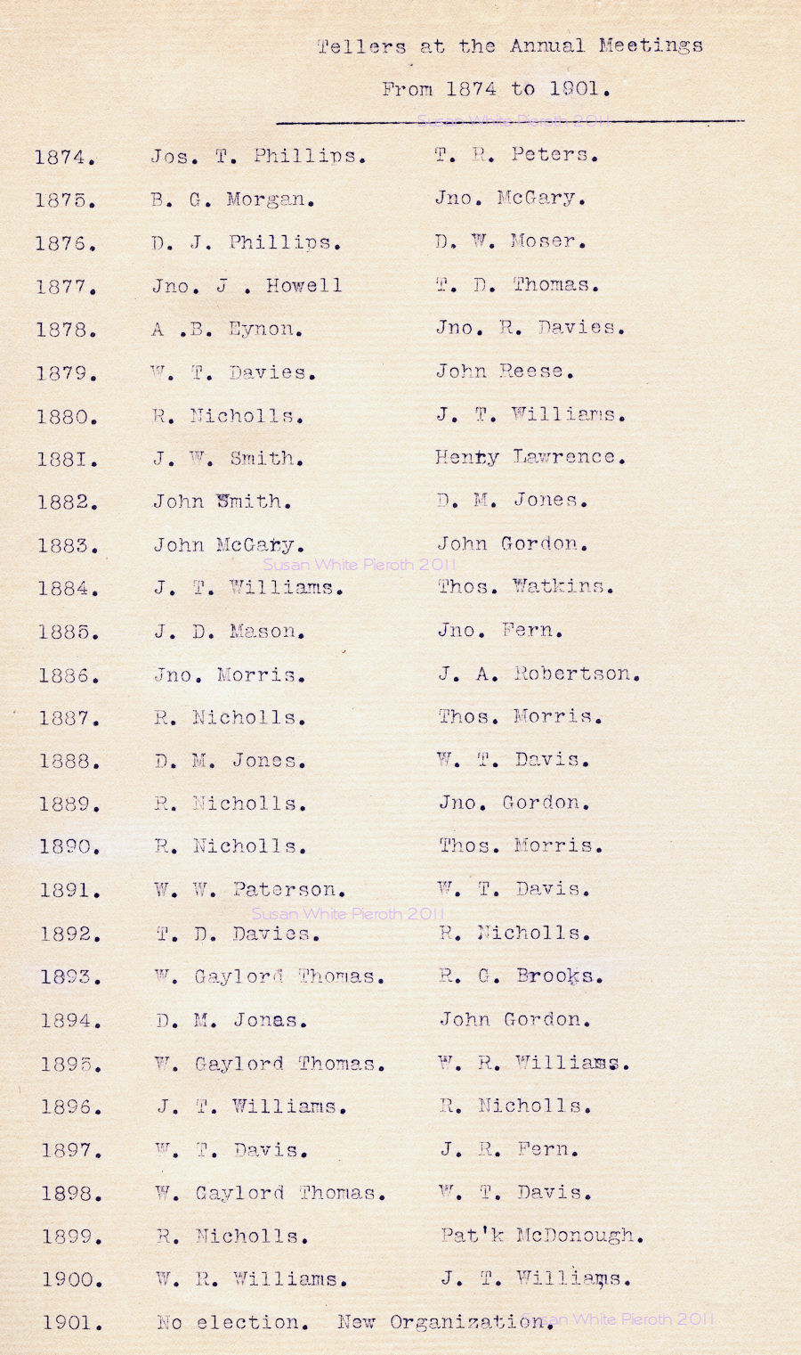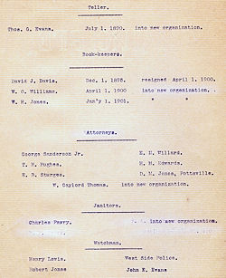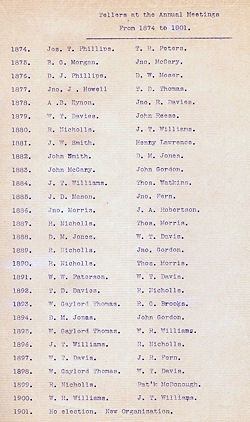 | Wm. J. Evans Thomas P. Gorden Morgan J. Williams John Gordon A. B. Eynon S. N. Stettler Thos. Watkins John McGary J. A. Robertson H. M. Edwards Thos. Watkins John Smith J. A. Robertson W. W. Paterson D. M. Jones Richard Nicholls J. H. Williams R. C. Brooks Wm. T. Davis W. Gaylord Thomas W. R. Williams John T. Williams | Geo. Sanderson Benj. Hughes Thos. D. Davies A. B. Stevens J. C. Sanderson E. C. Fuller F. V. Barnes J. A. Robertson Morgan Bowen Thos. Watkins John McGary J. A. Roberson A. B. Eynon Thos. Watkins T. E. Peters S. N. Stettler D. M. Jones Wm. J. Evans John Gordon John Smith H. M. Edwards W. W. Paterson |