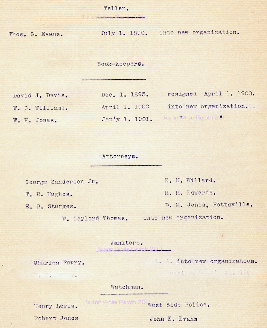 | George Sanderson Benjamin Hughes John T. Williams William T. Davis D. M. Jones John Gorden Reese C. Brooks William R. Williams A. B. Stevens Thos. D. Davies J. Gard. Sanderson Mr. McConklin Hugh Sawyer L. A. Powell A. B. Eynon |