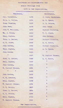 | Geo. Sanderson Thos. D. Davies Thos. Watkins John Fern John T. Williams Wm. J. Evans Benj. Hughes D. M. Jones John Gorden W. Gaylord Thomas H. M. Edwards R. G. Brooks | J. Gard. Sanderson A. B. Eynon T. R. Peters John Reese Richard Nicholls W. F. Clark John McCary Richard Nicholls W. Gaylord |