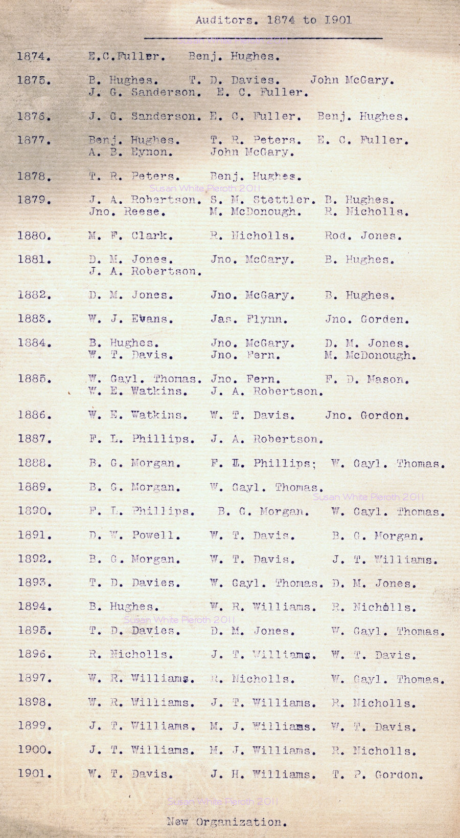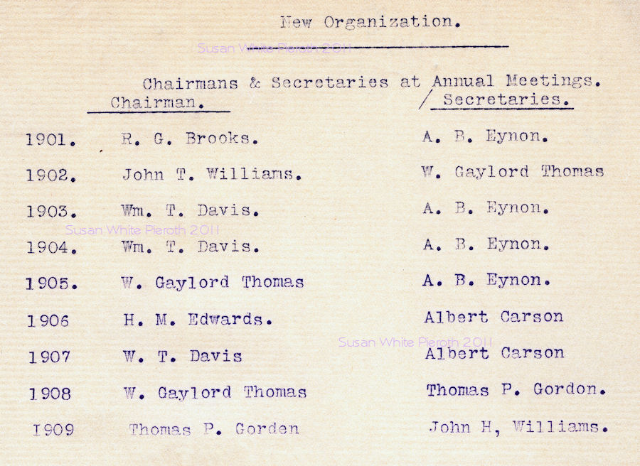 | R. G. Brooks John T. Williams W. T. Davis W. Gaylord H. M. Edwards Thomas P. Gorden | A. B. Eynon W. Garlord Albert Carson Thomas P. Gordon [sic] John H. Williams |