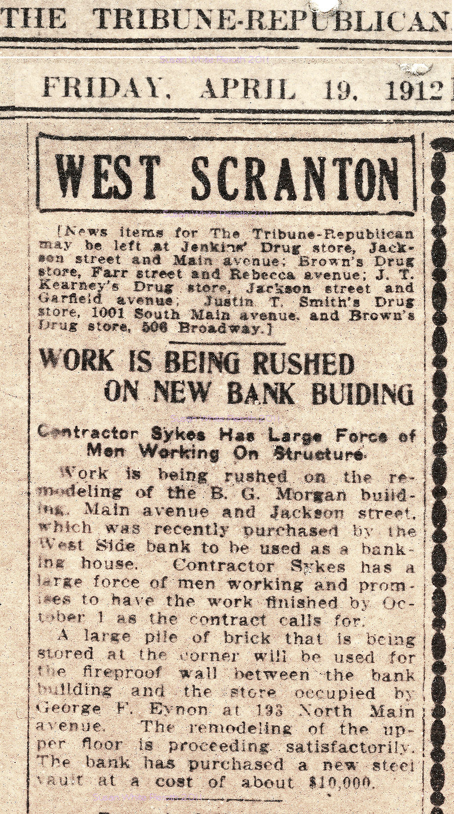 Work is being rushed on the B. G. Morgan building, Main avenue and Jackson street [pictured above, left]. |